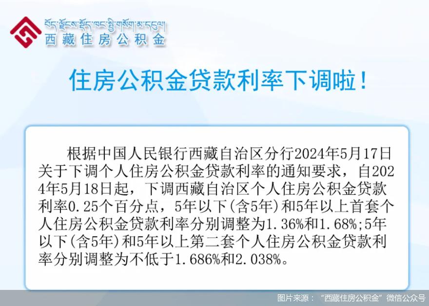 不过,也有地区公积金贷款利率执行更低标准。据“西藏住房公积金”公众号消息,根据人民银行西藏自治区分行要求,自5月18日起,下调西藏自治区个人住房公积金贷款利率0.25个百分点,5年以下(含5年)和5年以上首套个人住房公积金贷款利率分别调整为1.36%和1.68%;5年以下(含5年)和5年以上第二套个人住房公积金贷款利率分别调整为不低于1.686%和2.038%。