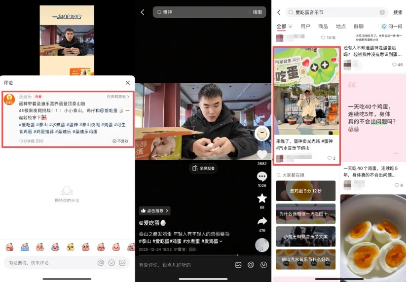 蓝鲸记者搜索发现,尽管数据平台尚未显示商单记录,但其最新作品《泰山之巅发鸡蛋》已有鸡蛋品牌露出(暂无法确认是否为商业合作),而品牌“圣迪乐”官方账号也发布动态认领了这一“露出”。此前受邀参与的音乐节中,“爱吃蛋”摊位所卖的水煮蛋也是该品牌产品。