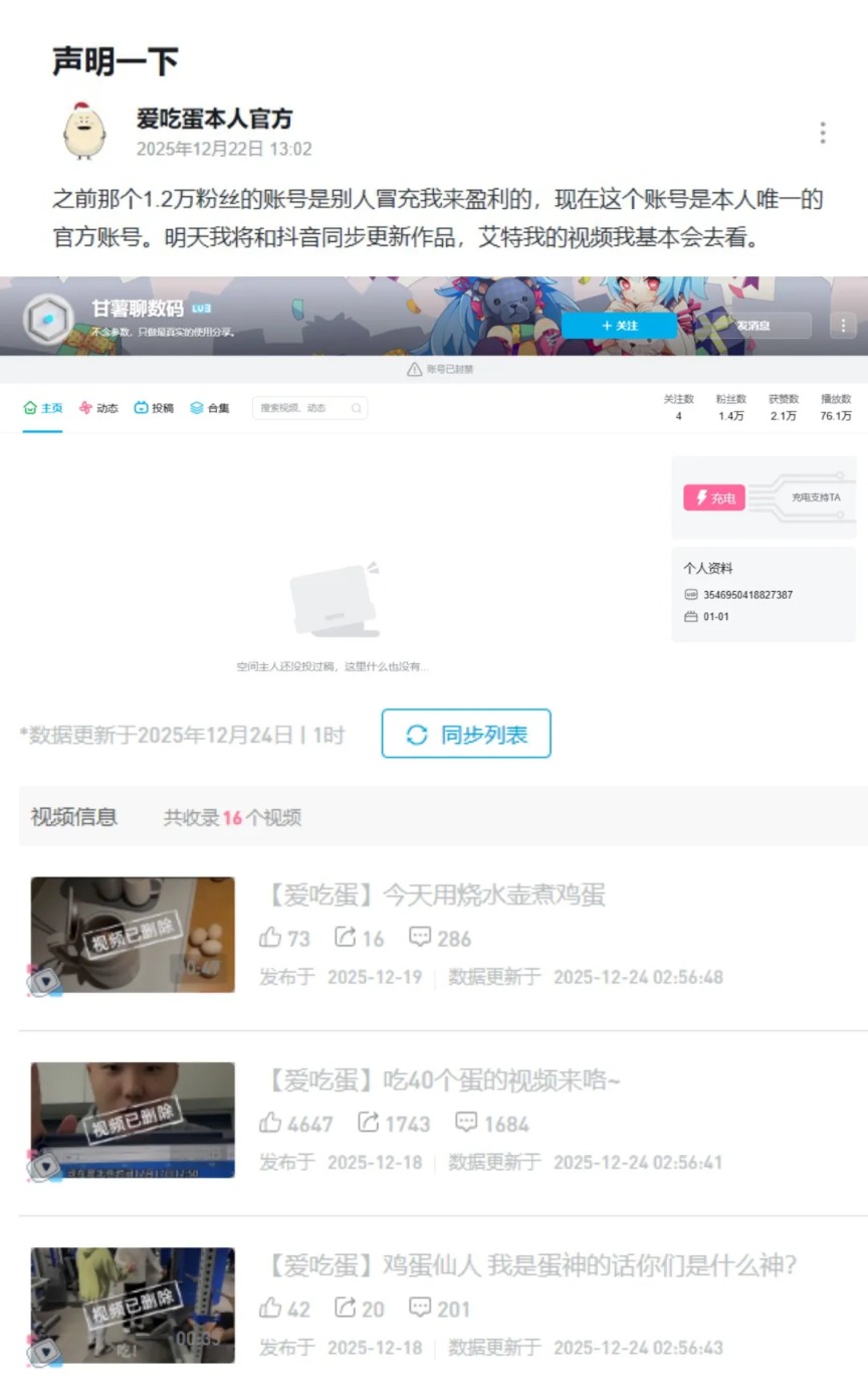 目前,多平台均存在一些名字类似“爱吃蛋”或者搬运其视频的账号。其中,B站账号“爱吃蛋本人官方”日前发布声明称,之前有一个1.2万粉丝的账号是别人冒充我来盈利的,现在这个账号是本人(在B站)唯一的官方账号。简介显示,该账号现已交由他人运营,IP地址为广西(“爱吃蛋”系山东人)。